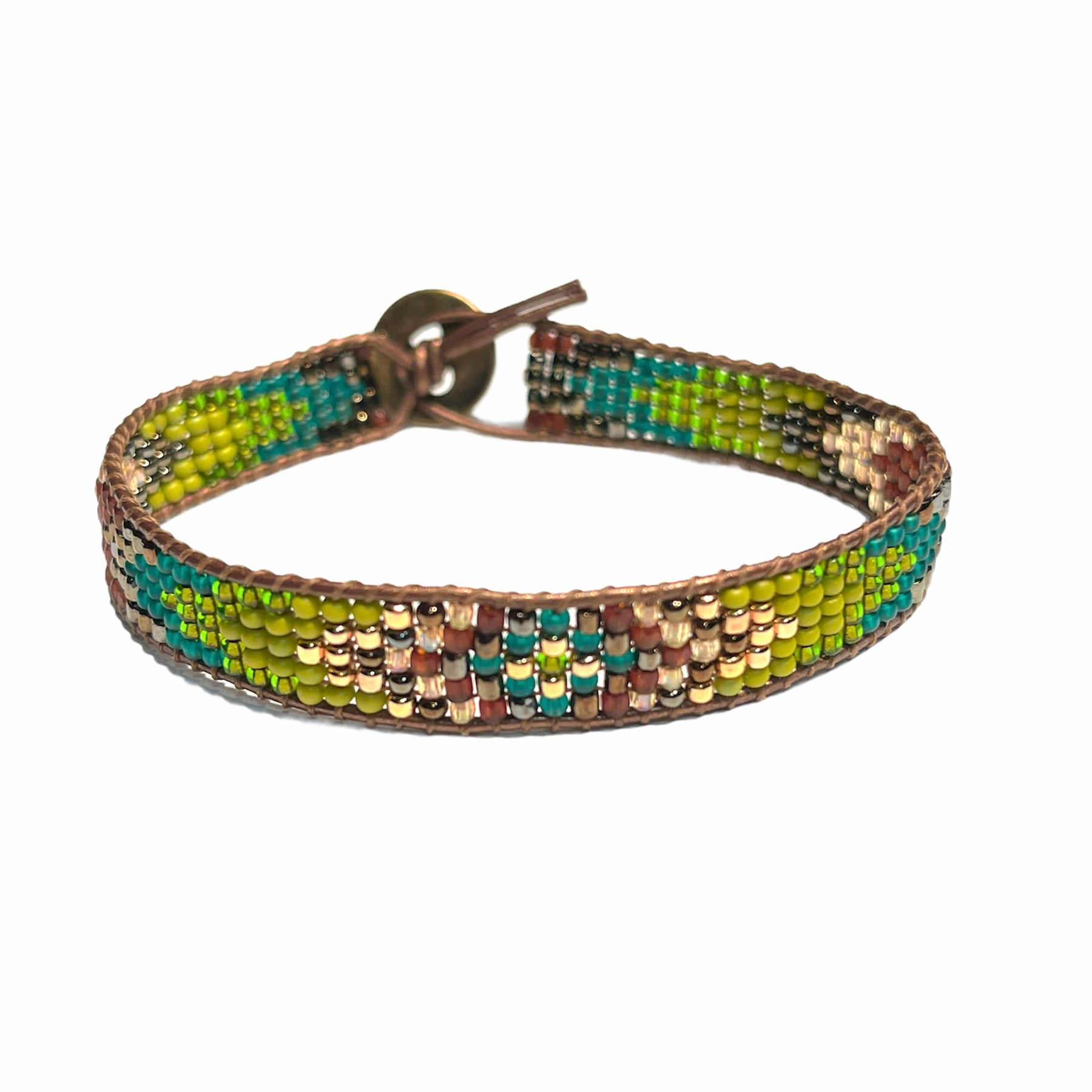 A brilliant array of luminous glass seed beads are framed by bronze leather cord.