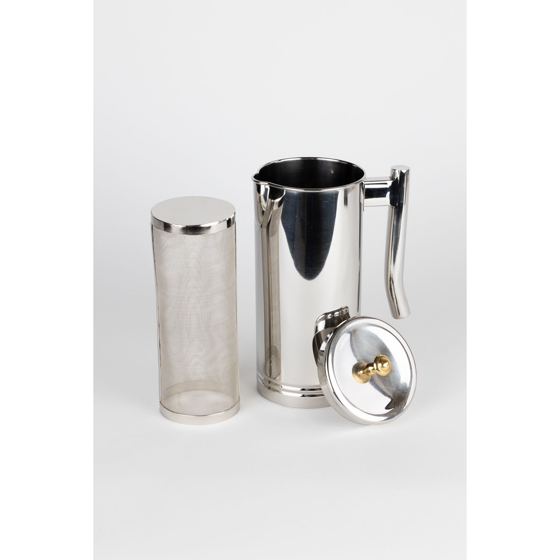 Strainer measures 3" in diameter x 7.6" high. Carafe measures 4" in diameter (widest width and not including handle) x 8.6" high (not including knob on top of lid). Handle 5.9" long.