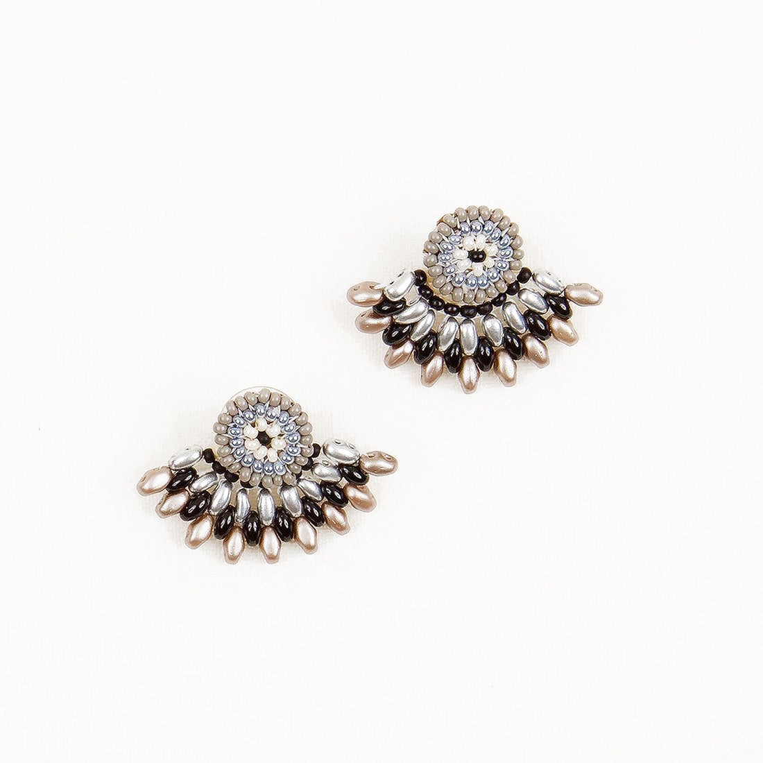 These versatile ear jackets offer a touch of effortless sophistication. Delicate silver beads shimmer with a cool, modern edge. Champagne beads add warmth and subtle sparkle, reminiscent of a moonlit night. Rich black beads ground the design, creating a timeless and elegant look.