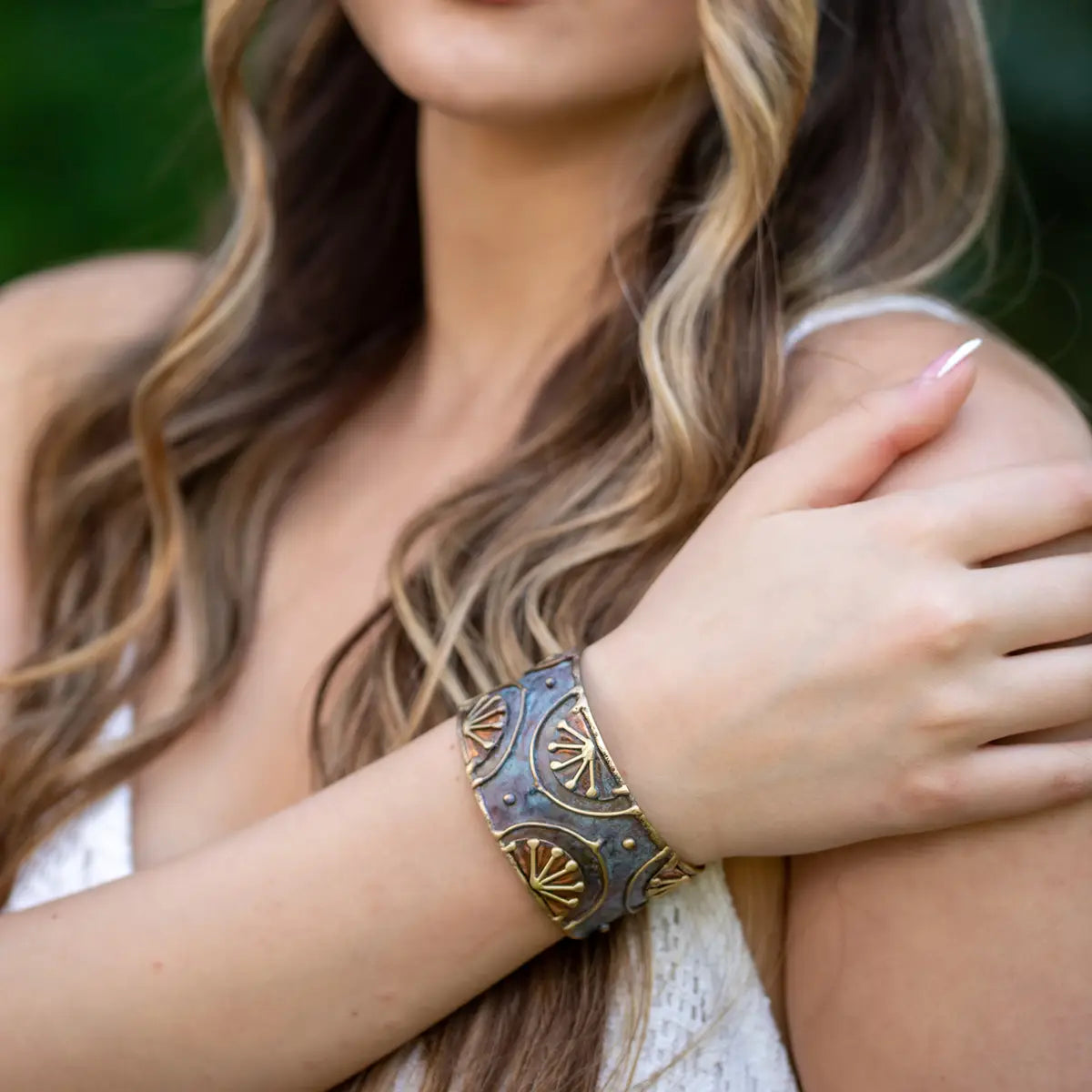Our Handcrafted Brass Patina Adjustable Blue Sun Cuff features a beautiful patina finish that enhances the natural beauty of brass, creating a unique and vibrant color palette with a beautiful sun design. Perfect for adding a bold statement to any outfit, this cuff is both an accessory and a conversation piece.