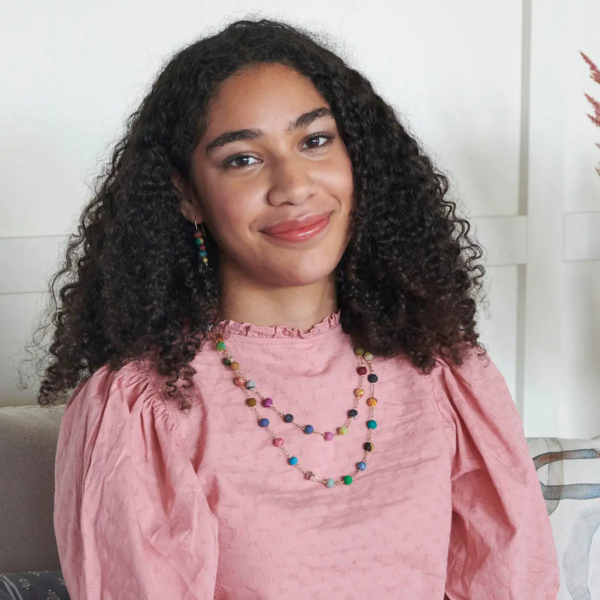 Step 3:Once a number of beads have been crafted, they are strung together into a necklace, wrapped with wire and added into a cuff bracelet, or transformed into an earring, often incorporating modern elements like metallic paillettes, brass metal accent beads, or mixed-metal seed beads. Artisans assort the beads so the final piece of jewelry has a unique array of colors and patterns. The result is a Kantha design as unique as the artisan that crafted it!