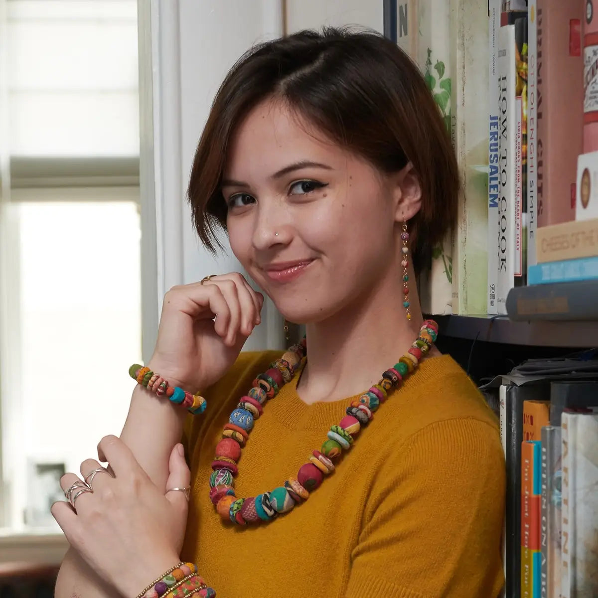 Step 3:Once a number of beads have been crafted, they are strung together into a necklace, wrapped with wire and added into a cuff bracelet, or transformed into an earring, often incorporating modern elements like metallic paillettes, brass metal accent beads, or mixed-metal seed beads. Artisans assort the beads so the final piece of jewelry has a unique array of colors and patterns. The result is a Kantha design as unique as the artisan that crafted it!