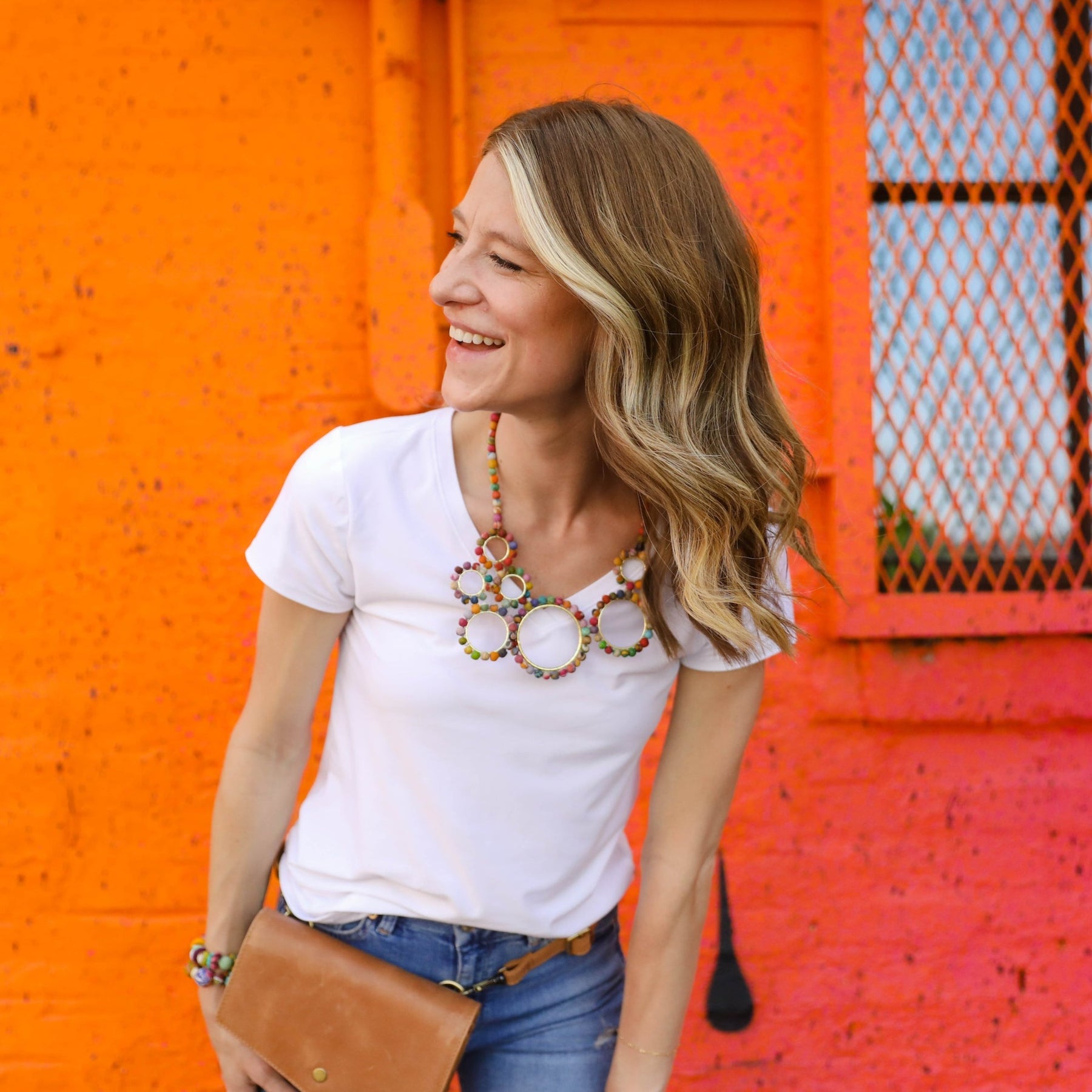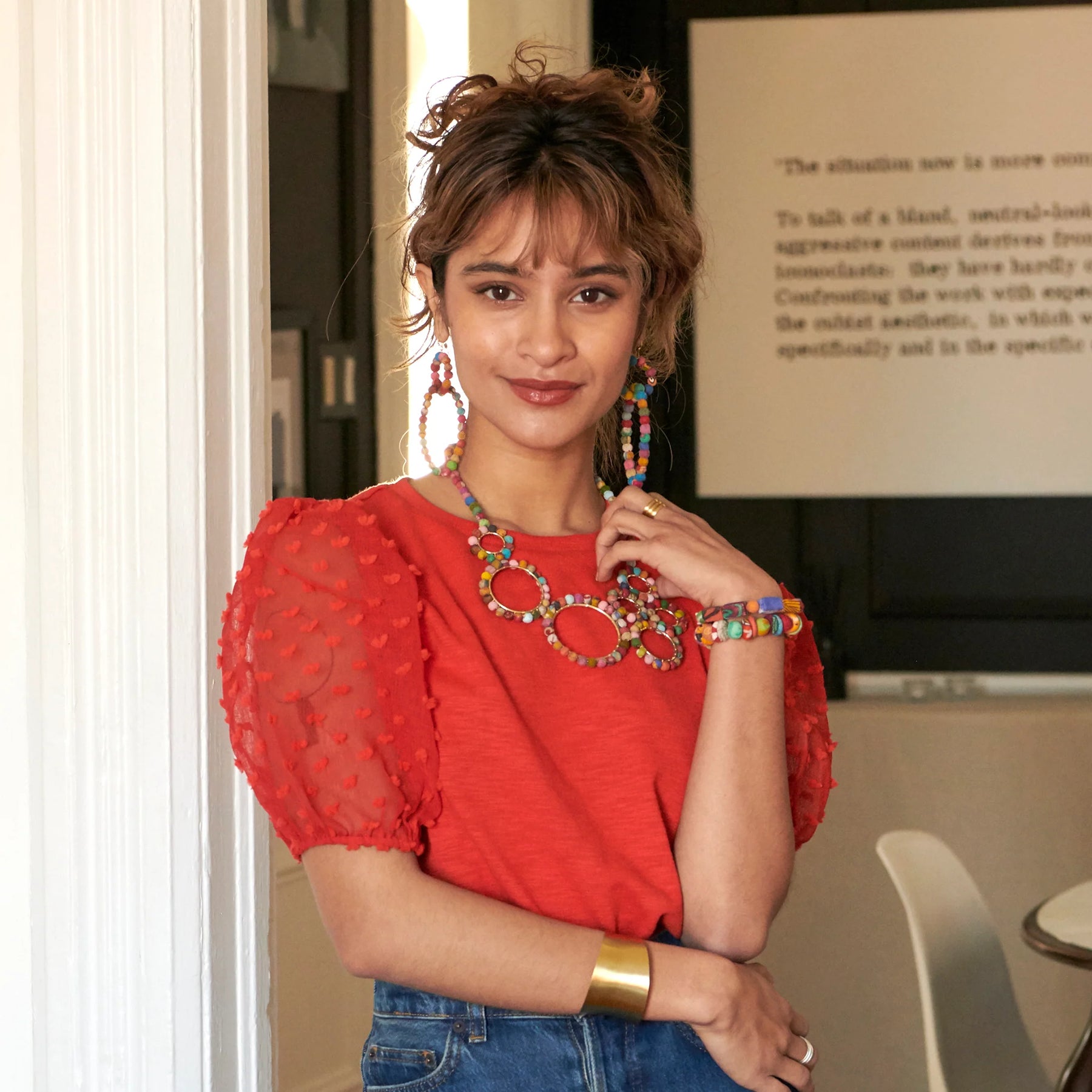 Seven metallic rings are lined with colorful Kantha beads and artfully arranged to create this statement style. Incredibly lightweight, this geometric piece looks amazing with everything from basics to evening dresses. Each will be slightly different as they're crafted from upcycled Kantha and Sari textiles.