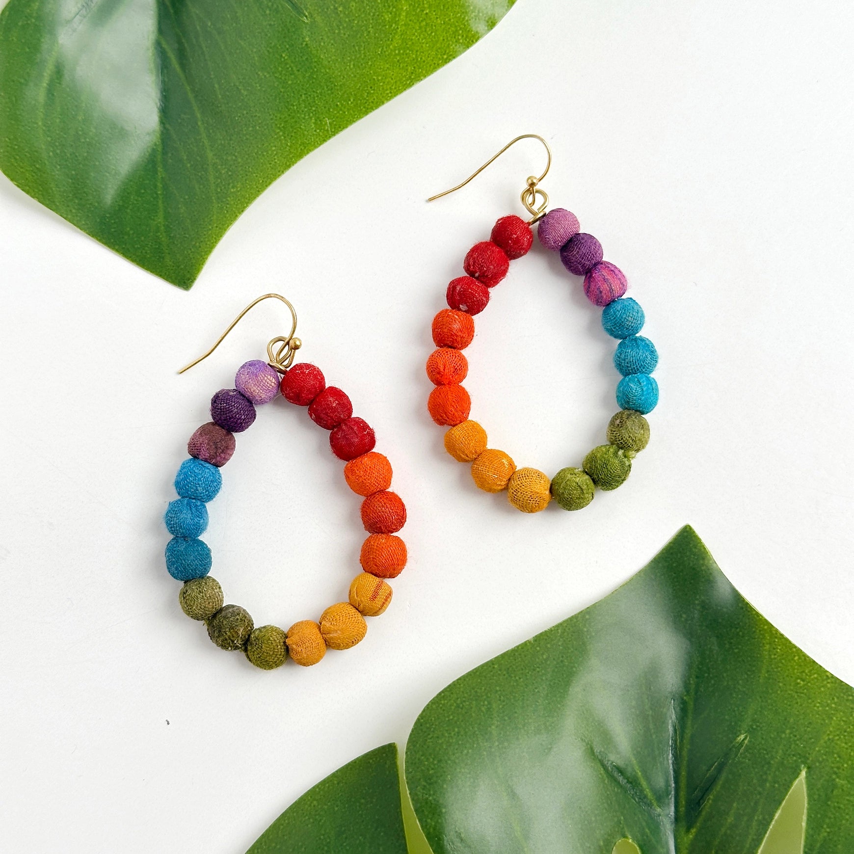 The Kantha Rainbow Collection takes Kantha color to a new level! Beads have been sorted and arranged into vibrant, color-blocked sections for an multichromatic rainbow-like display of color. These Kantha Rainbow Teardrop Earrings are a vivid take on a classic, everyday style that lets it’s rainbow hues be the star of the show. It's thoughtfully crafted from reclaimed Kantha & Sari textiles that have been hand-sorted, so each piece is slightly different.