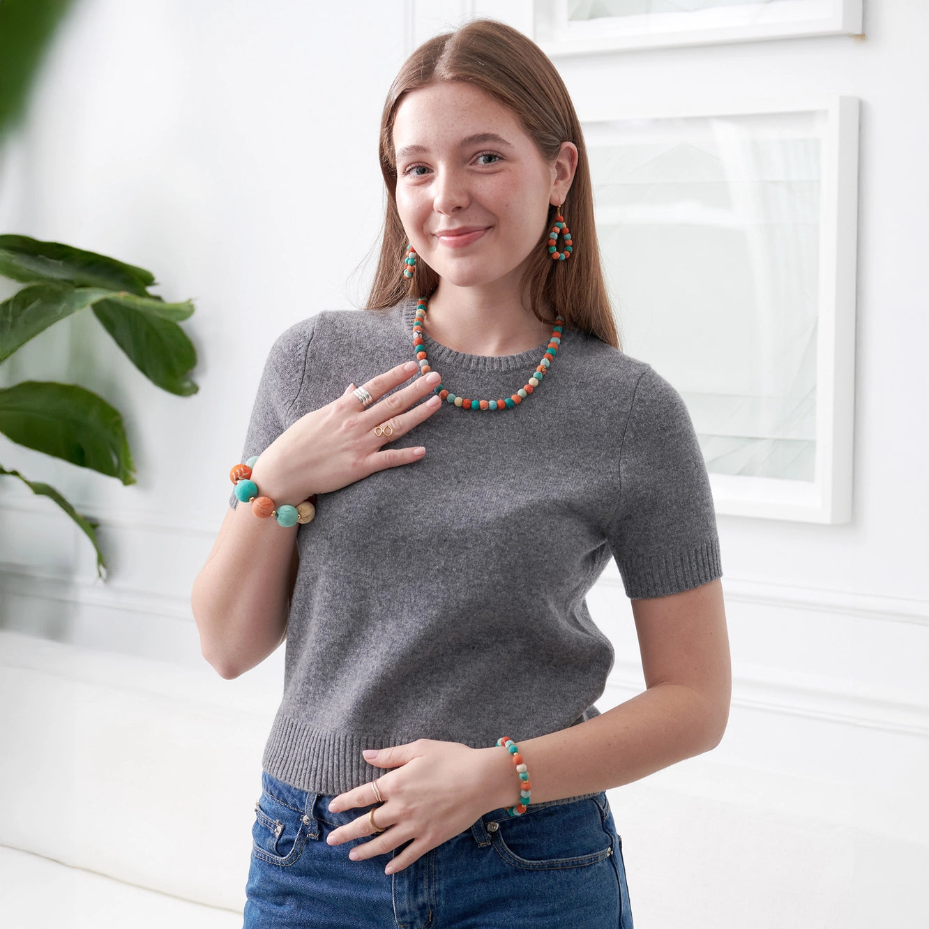 Inspired by the landscape of the southwest dessert, the Kantha Southwest Collection includes our best-selling kantha styles in shades of turquoise, burnt orange, and cream. The Kantha Southwest Sonnet Bracelet features groups of colorized Kantha beads separated by smaller metallic beads. It is thoughtfully crafted from reclaimed Kantha & Sari textiles that have been hand-sorted, so each piece is slightly different. • Measures 6" internal circumference. Beads measure 3/8" wide. Bracelet stretches to fit most. • Sustainably handmade by women artisans in India.