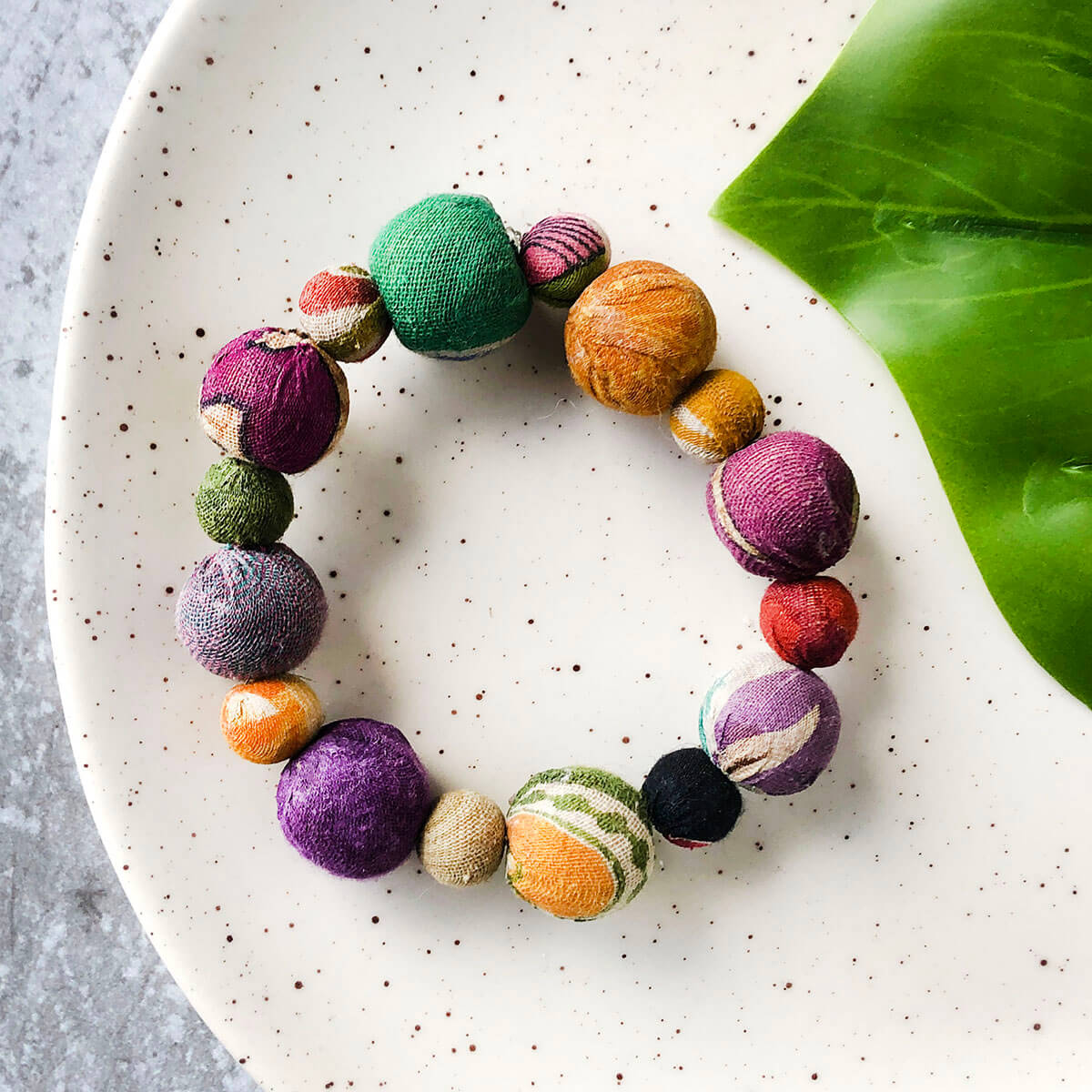 Kantha quilts are a traditional textile found in abundance in India. They are made from layers of worn cotton saris, sewn together with a distinctive, allover running stitch. Artisans transform the fabric scraps into beads for jewelry, which provides new life to a textile that is often discarded.