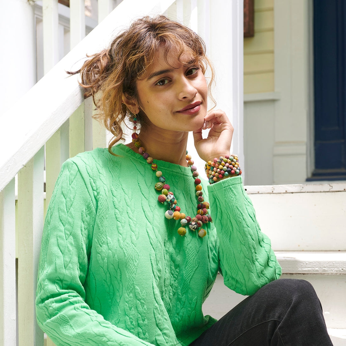 Step 3:Once a number of beads have been crafted, they are strung together into a necklace, wrapped with wire and added into a cuff bracelet, or transformed into an earring, often incorporating modern elements like metallic paillettes, brass metal accent beads, or mixed-metal seed beads. Artisans assort the beads so the final piece of jewelry has a unique array of colors and patterns. The result is a Kantha design as unique as the artisan that crafted it!