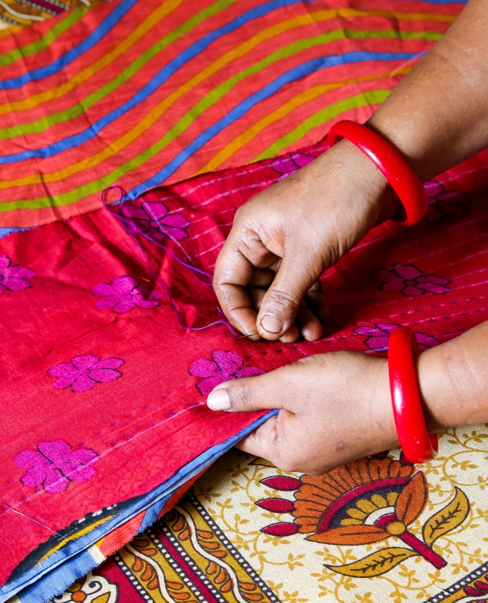 In our kantha products, layers of used saris are sewn together with a repeated running stitch to make a quilted textile that is both functional and beautiful. Complimentary patches are applied where the fabric has torn or worn thin, adding unique beauty.