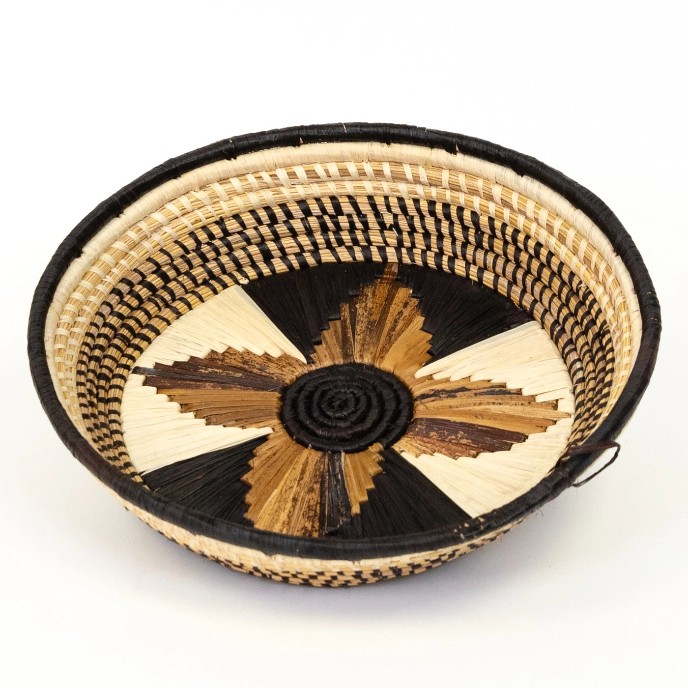 Our fair trade, decorative bowl is handwoven from hand dyed raffia grass. African baskets like these are ideal to use as fruit bowls or bread baskets, for tabletop storage of remotes, keys and more, and/or as wall art. They also make perfect housewarming or occasion gifts. All our bowl baskets come with a hook to hang as wall decor. Raffia is a renewable, sustainable, and biodegradable alternative to plastic that can be harvested multiple times a year and does not require pesticides to thrive. Raffia is a natural fiber with properties similar to other eco-friendly materials like bamboo and hemp. Dimensions: Large: diameter: 12”-14”; depth: 4” Materials: raffia