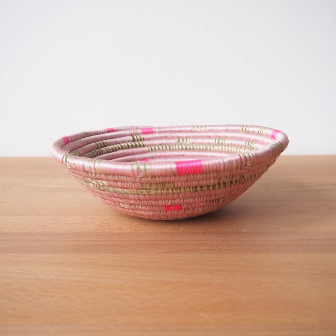 This sisal, woven basket is 8" in diameter and woven by our artisans in Gitarama, Rwanda. Each sisal Rwandan basket comes with a string attached to the back so that you can hang it on the wall. In addition to making a beautiful table display, these baskets can also be hung as art. You can combine them with other baskets or works of art to make a feature wall collage.